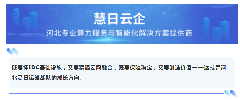 在河北慧日,运维不再是一份“看不见的工作”,而是一条通往技术专家、解决方案架构师甚至业务开拓者的成长之路。我们期待每一位运维队员在这里:懂技术、能打仗、会盈利——成为数字时代真正的运维铁军。